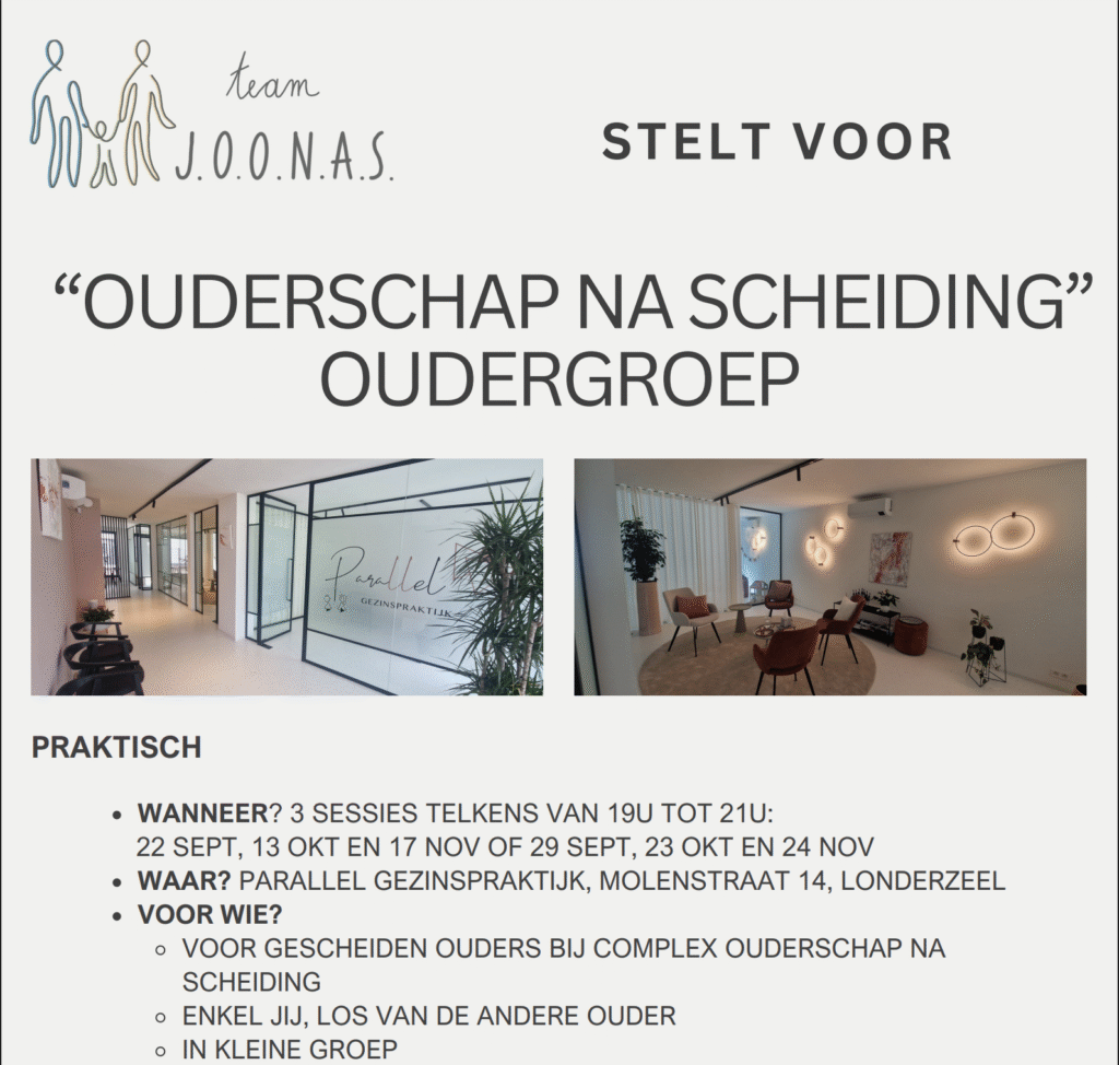 Voor ouders die interesse hebben om met enkele andere ouders in een klein groepje sessies te volgen rond parallel solo ouderschap, verlies, lasten en communicatie bij scheiding. Deze sessies worden o.a. gegeven door Sophie Vanhemmens en Vanessa Maes en vallen onder de conventie (excl. beperkte administratie/cateringkost). Inschrijven kan via deze knop en je krijgt bijkomende informatie (of via de flyer). Achteraf ontvang je een certificaat van attest van deelname.